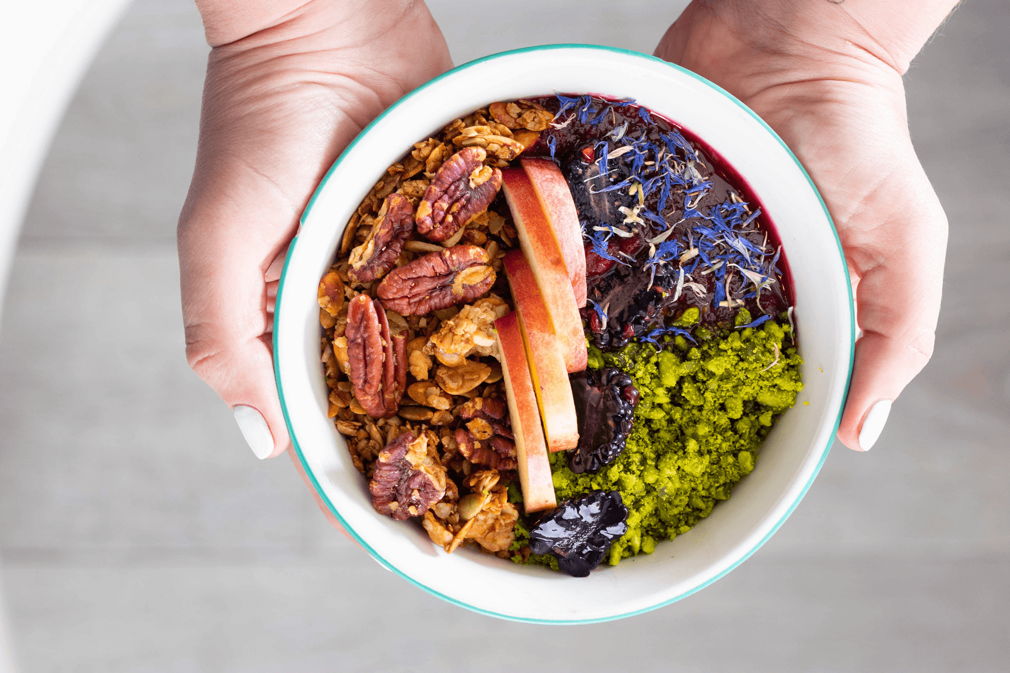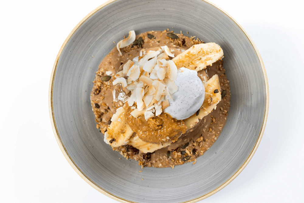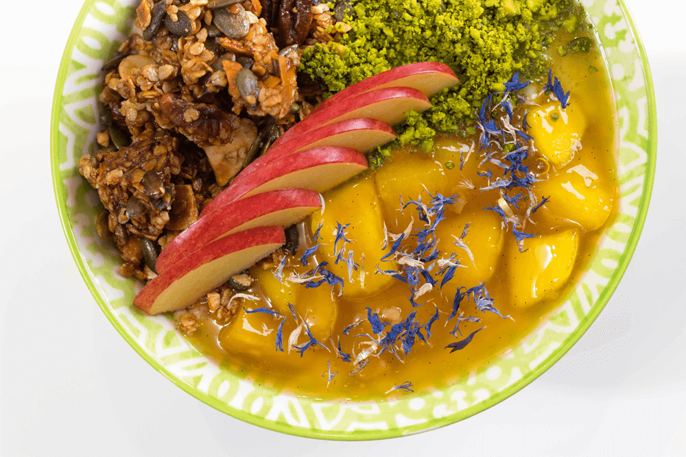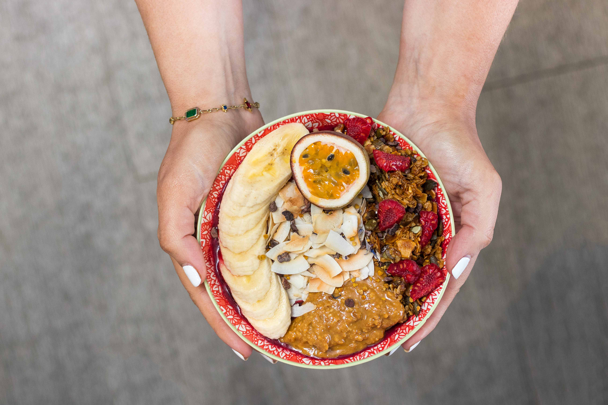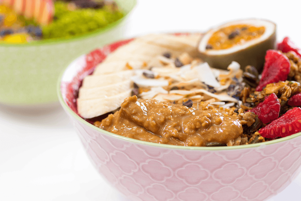 Nut cluster, toasted quinoa granola, banana, peanut butter, passion fruit, toasted coconut, goji berries, cacao nibs, bee pollen 5, 8 (pecan, almond)