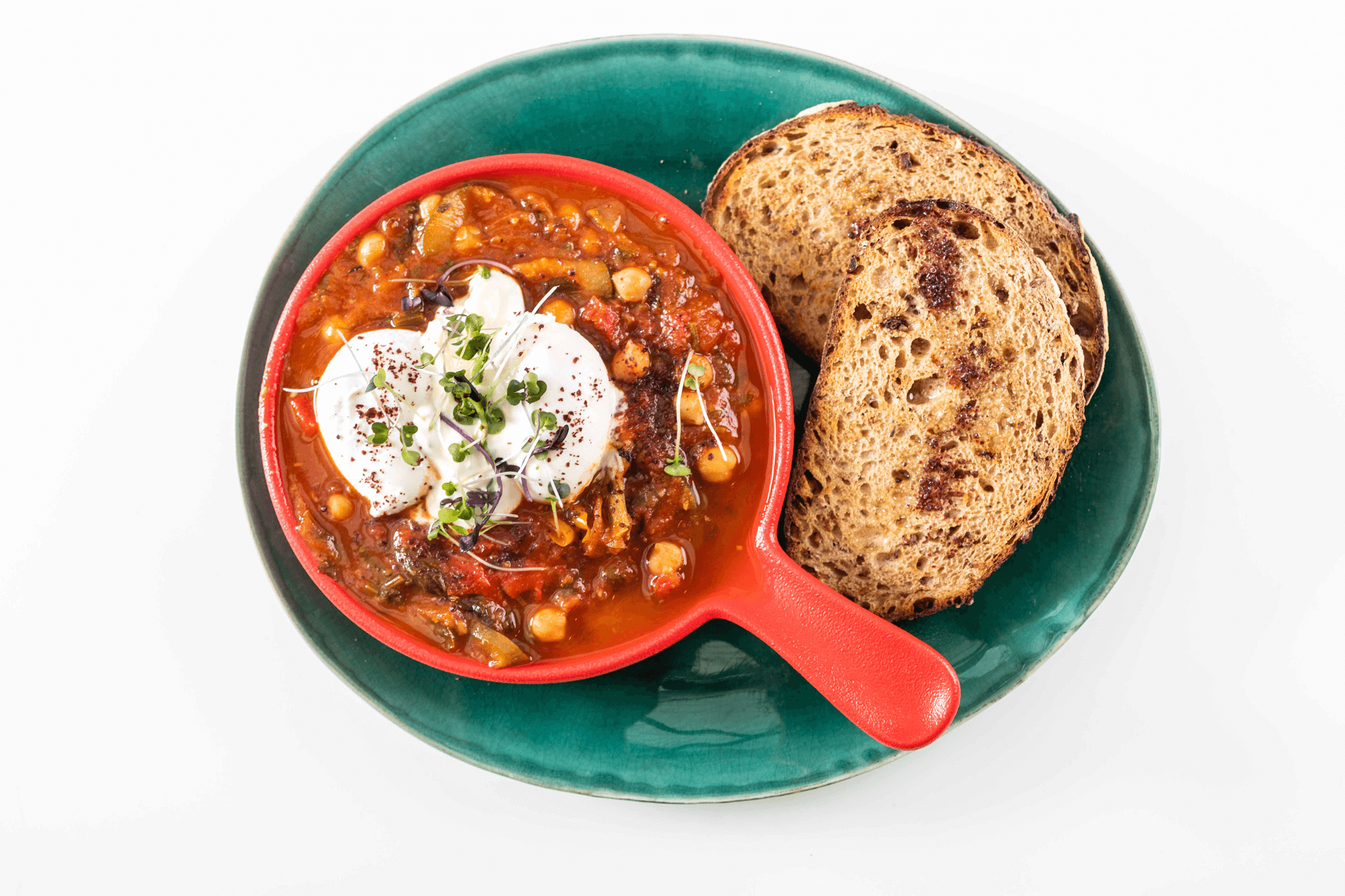 Poached Eggs, tomato, zaatar, chickpea, harissa and coriander yogurt, toasted sourdough 1(wheat), 3, 6, 7, 11