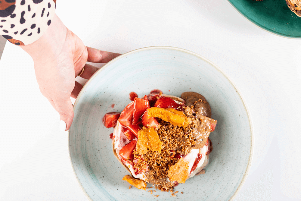 Vanilla Mascarpone cream, strawberry, mango honeycomb, almond butter 3, 7, 8 (almond)