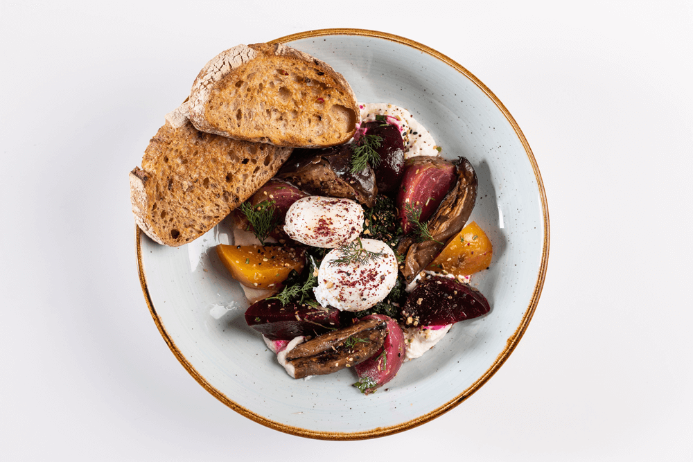 Yuzu aubergines, galangal beets, poached egg, feta yogurt, Aleppo chilli and sea salt pumpkin seeds 1 (wheat), 3, 7, 12