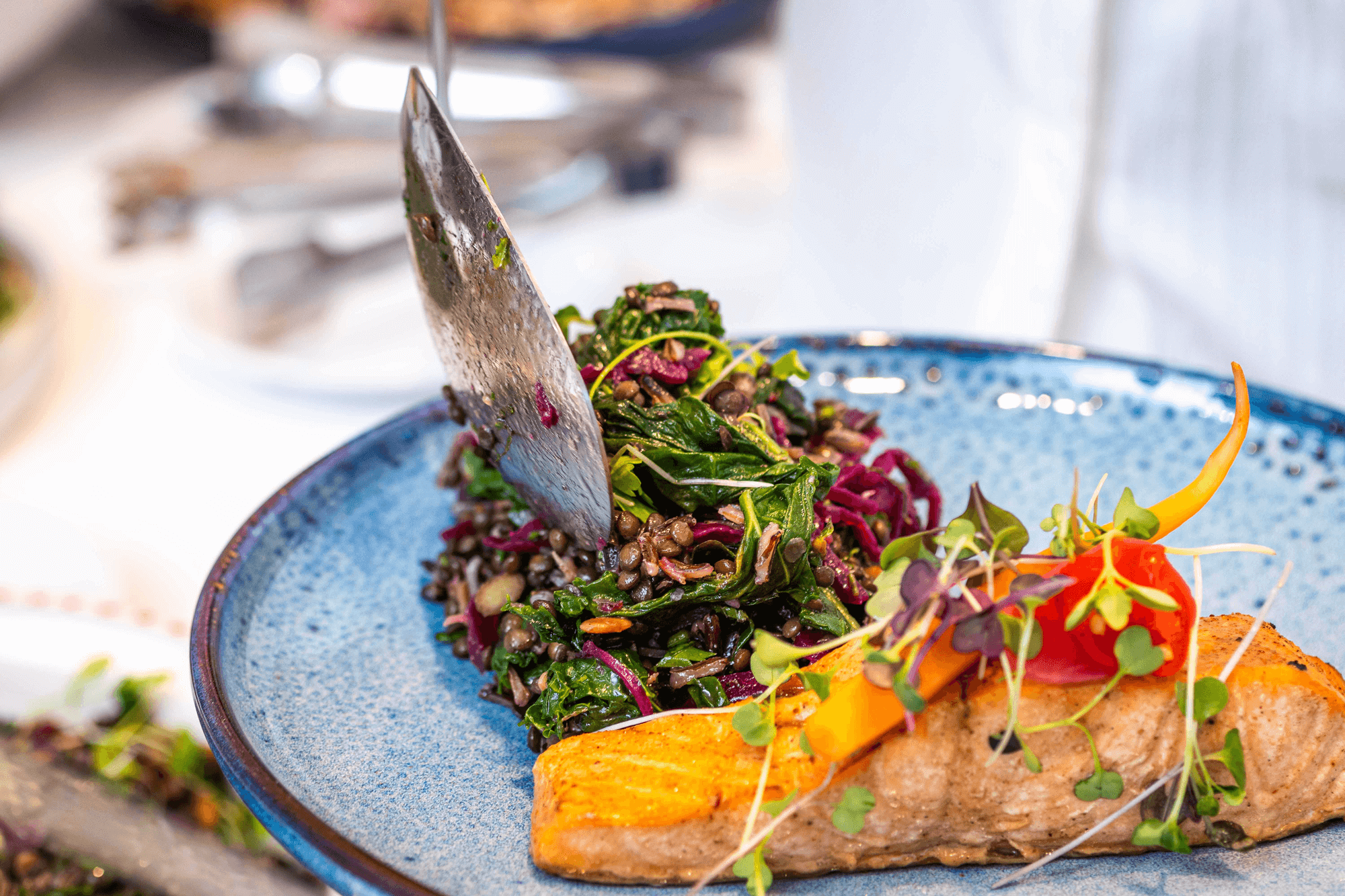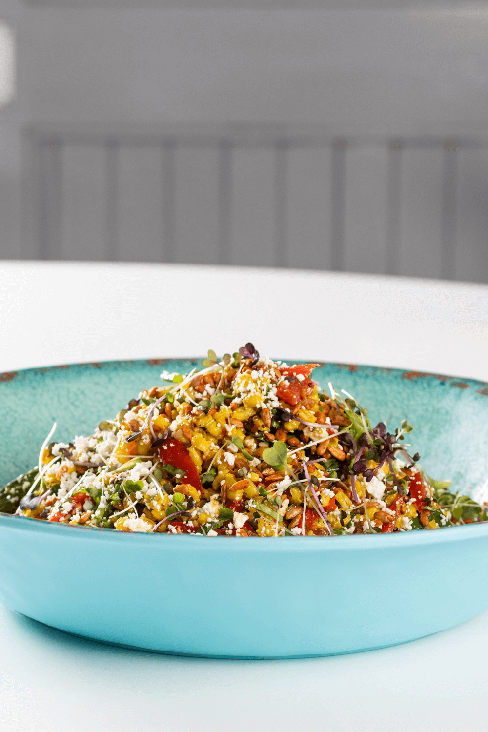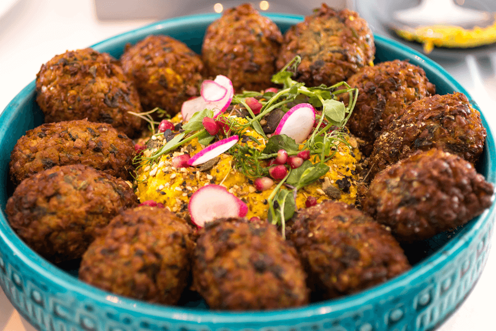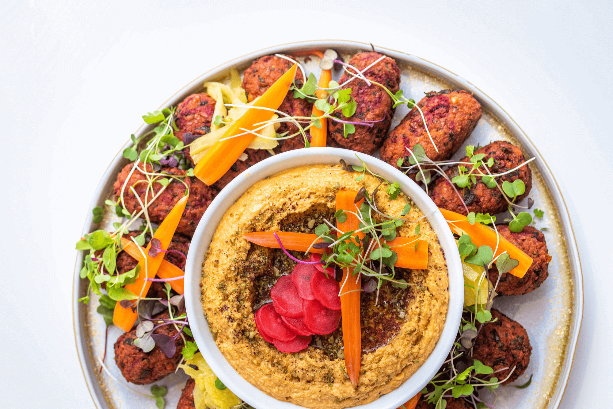 Yuzu aubergines, galangal beets, poached egg, feta yogurt, Aleppo chilli and sea salt pumpkin seeds 1 (wheat), 3, 7, 12
